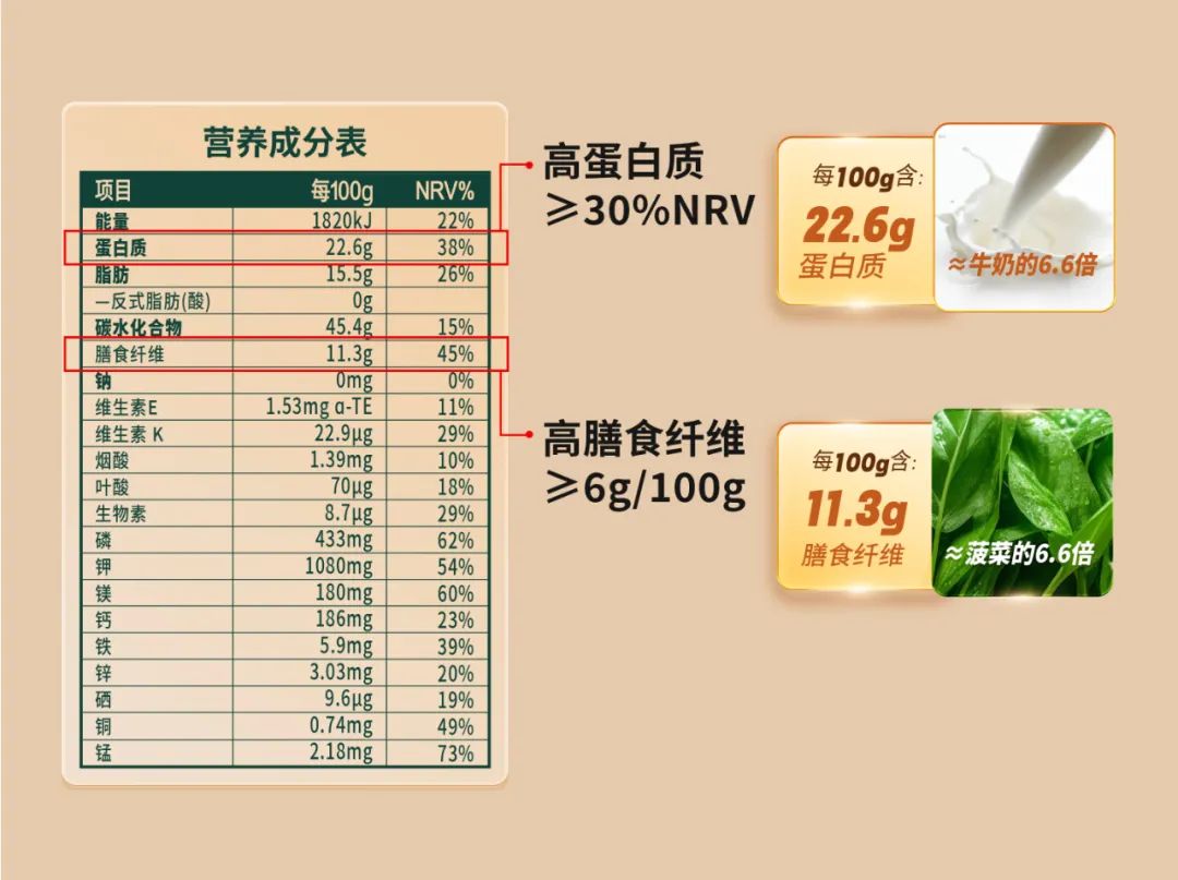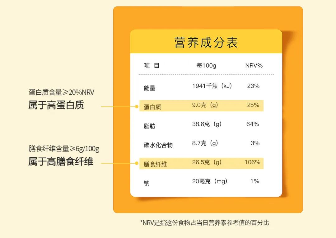蛋白质:面对琳琅满目的食品,蛋白质含量是非常重要的一项营养数据。固体食品的蛋白质含量大于等于20%NRV,才叫“高蛋白质”。蛋白质对增强免疫、维持肌肤饱满弹性等都很有好处。由于平时饮食偏差,很多人蛋白质摄入严重不足,建议选择蛋白质含量较高的食品。 膳食纤维:膳食纤维总量(或可溶性膳食纤维、不溶性膳食纤维或单体成分)≥6g/100g(固体),才叫“高膳食纤维”。膳食纤维有利于肠道蠕动、增强饱腹感、保持身材。建议平时可以选择购买高膳食纤维的食品。